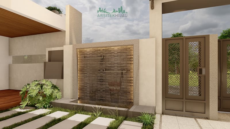 Konsep desain ini menempatkan teras sebagai salah satu elemen utama pada fasad rumah. Dinding batu alam memberikan tekstur alami yang mewah, kemudian air terjun menciptakan kesan ekslusif dan menenangkan.