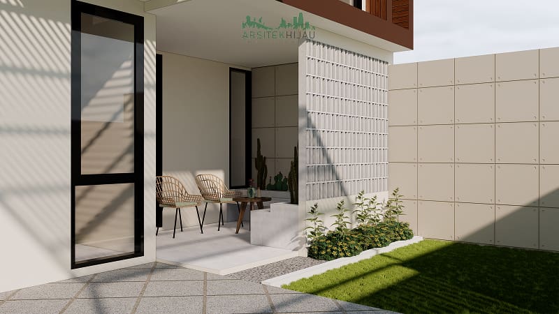Penggunaan partisi roster atau kisi-kisi beton menjadi elemen pemanis yang berfungsi sebagai pembatas antara teras dan taman. Desain ini membentuk privasi tanpa membuat teras terasa tertutup. Area duduk menghadap ke arah yaman yang menciptakan suasna lebih cozy.