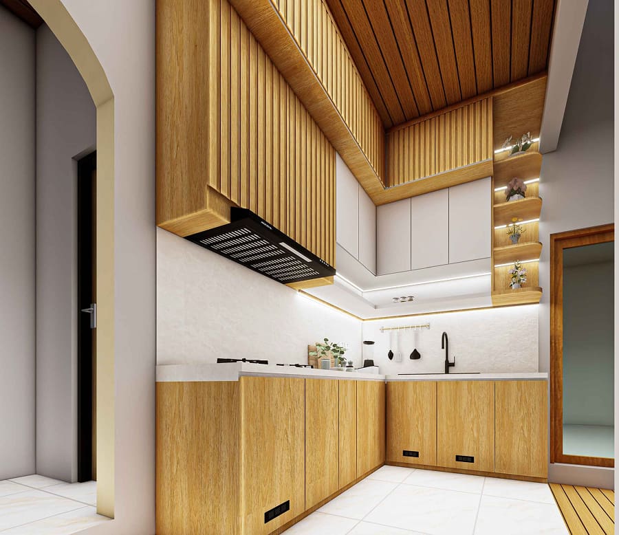 Dominasi material kayu natural pada kitchen set memberikan karakter yang elegan dengan suasana yang nyaman untuk beraktivitas. Garis desain yang bersih dipadukan dengan pencahayaan tersembunyi, mempertegas kesan modern pada kitchen set. Sementara itu, warna-warna terang pada dinding dan lantai membantu menciptakan ruang yang terasa luas, bersih, dan terang sepanjang hari.