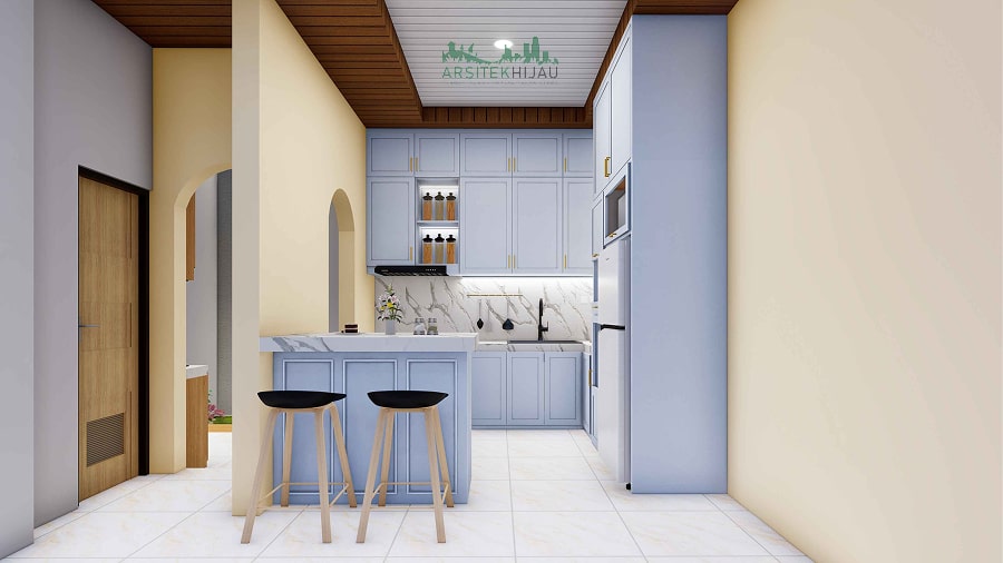 Keberadaan area bar menjadi elemen yang memperkaya fungsi dapur. Area ini dirancang dengan sentuhan warna lembut yang berpadu dengan material bermotif marmer yang menciptakan kesan halus dan eksklusif. Bentuk lengkung pada bukaan dan detail arsitekturalnya memberikan aksen visual yang memperhalus komposisi ruangnya yang menjadikan area bar sebagai titik temu antara fungsi, estetika, dan kenyamanan dalam satu kesatuan desain.