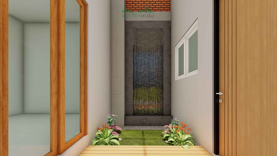 Inner court menjadi elemen utama yang memperkuat kualitas ruang dalam hunian ini. Area ini dirancang sebagai ruang terbuka di tengah rumah yang memberikan pencahayaan alami dan sirkulasi udara yang maksimal, sekaligus juga menciptakan suasana tenang dan menyegarkan. Perpaduan antara tanaman hijau, lantai kayu, dan dinding yang berwarna netral, menciptakan dialog visual yang harmonis antara alam dan arsitektur modern. Kehadiran inner court ini tidak hanya berfungsi sebagai elemen keestetikan dalam rumah, melainkan juga menjadi ruang jeda yang memberikan pengalaman ruang yang lebih hidup dan bernilai.