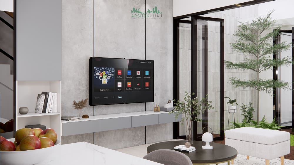 Ruang keluarga dirancang sebagai pusat aktivitas yang menampilkan karakter desain secara utuh. Dinding aksen berfinishing beton menjadi latar yang kuat pada area televisi yang dipadukan dengan furnitur built-in berwarna abu-abu yang sederhana dan presisi. Tata pencahayaannya dibuat fokus dan terarah untuk mempertegas tekstur materialnya sehingga terbentuk suasana hangat yang maskulin. Bukaan lebar dengan pintu kaca lipat menghadirkan koneksi visual yang kuat antara innner corut yang menuju ke arah ruang gym.