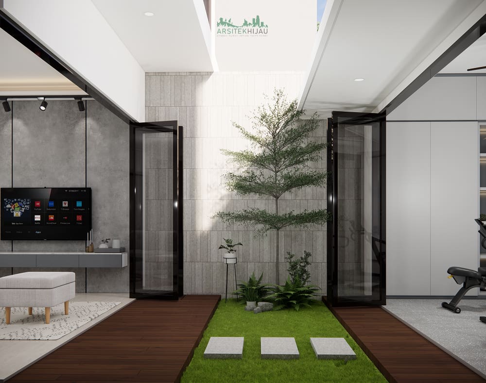 Inner court dihadirkan sebagai elemen yang memberikan keseimbangan antara kesan industrial dan sentuhan alami. Area taman di tengah rumah ini tehubungan dengan ruang keluarga dengan ruang gym yang dirancang dengan komposisi rumput hijau, tanaman vertikal, serta lantai kayu yang menciptakan kontras lembut terhadap dominasi material keras di sekitarnya.