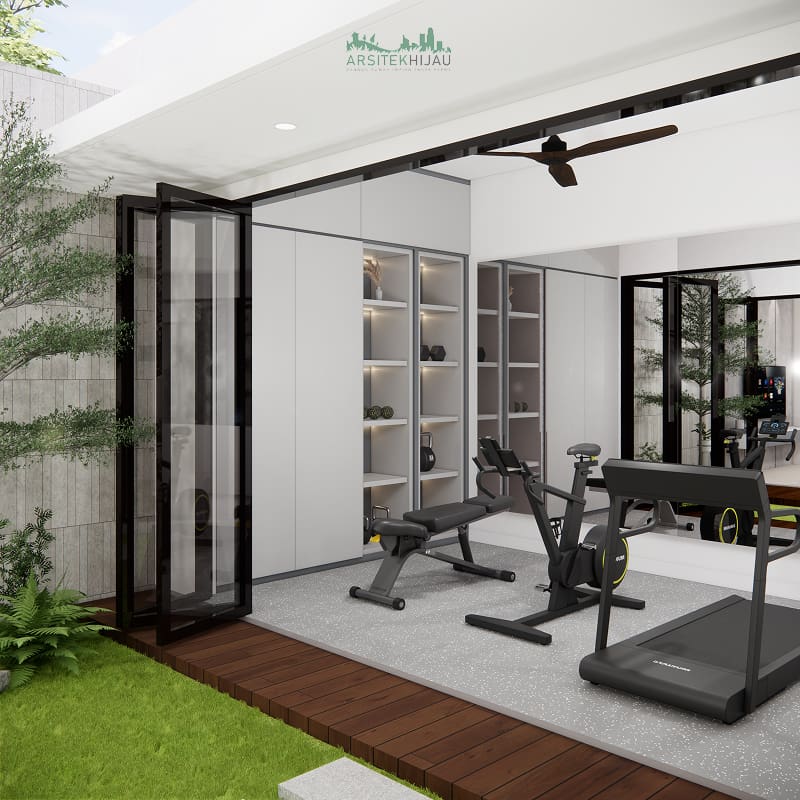 Ruang gym dirancang sebagai fasilitas privat yang menyatu dengan konsep hunian secara keseluruhan. Penataan peralatan olahraga sangat rapi dengan memanfaatkan sistem penyimpanan built-in yang tersembunyi sehingga menjaga estetika ruang tetap bersih dan terorganisir.