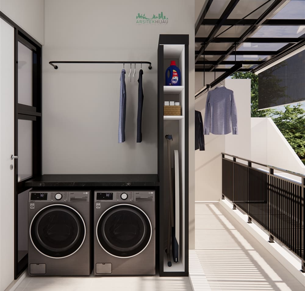 Area laundry dirancang dengan pendekatan minimalis yang efisien dan rapi. Penempatan mesin cuci dan penyimpanannya dibuat menyatu dalam satu komposisi vertikal yang rapi dan tidak terasa sempit. Area Laundry berada di lantai dua dengan akses langsung ke area balkon belakang rumah. Desain sederhana namun fungsional ini mencerminkan perhatian pada detail kecil yang mendukung kualitas hidup sehari-hari.