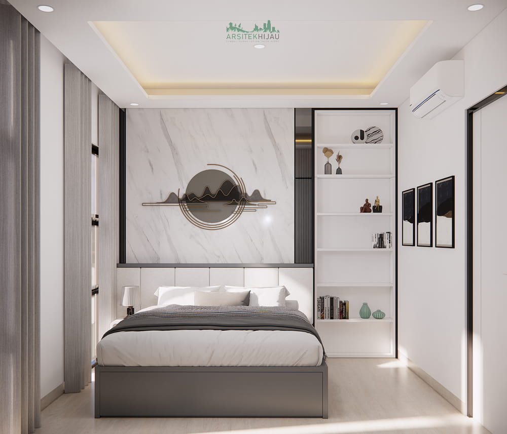 Kamar tidur utama dirancang sebagai tempat beristirahat yang benar-benar memberi rasa tenang. Palet warna lembut membantu menciptakan suasana yang menenangkan.Tempat peletakan furnitur dibuat menyatu dengan dinding untuk menjaga visual tetap bersih dan tidak terasa penuh. Cahaya alami yang masuk dari jendela besar menyempurnakan ruang ini, menjadikannya area privat yang nyaman untuk memulai dan mengakhiri hari.
