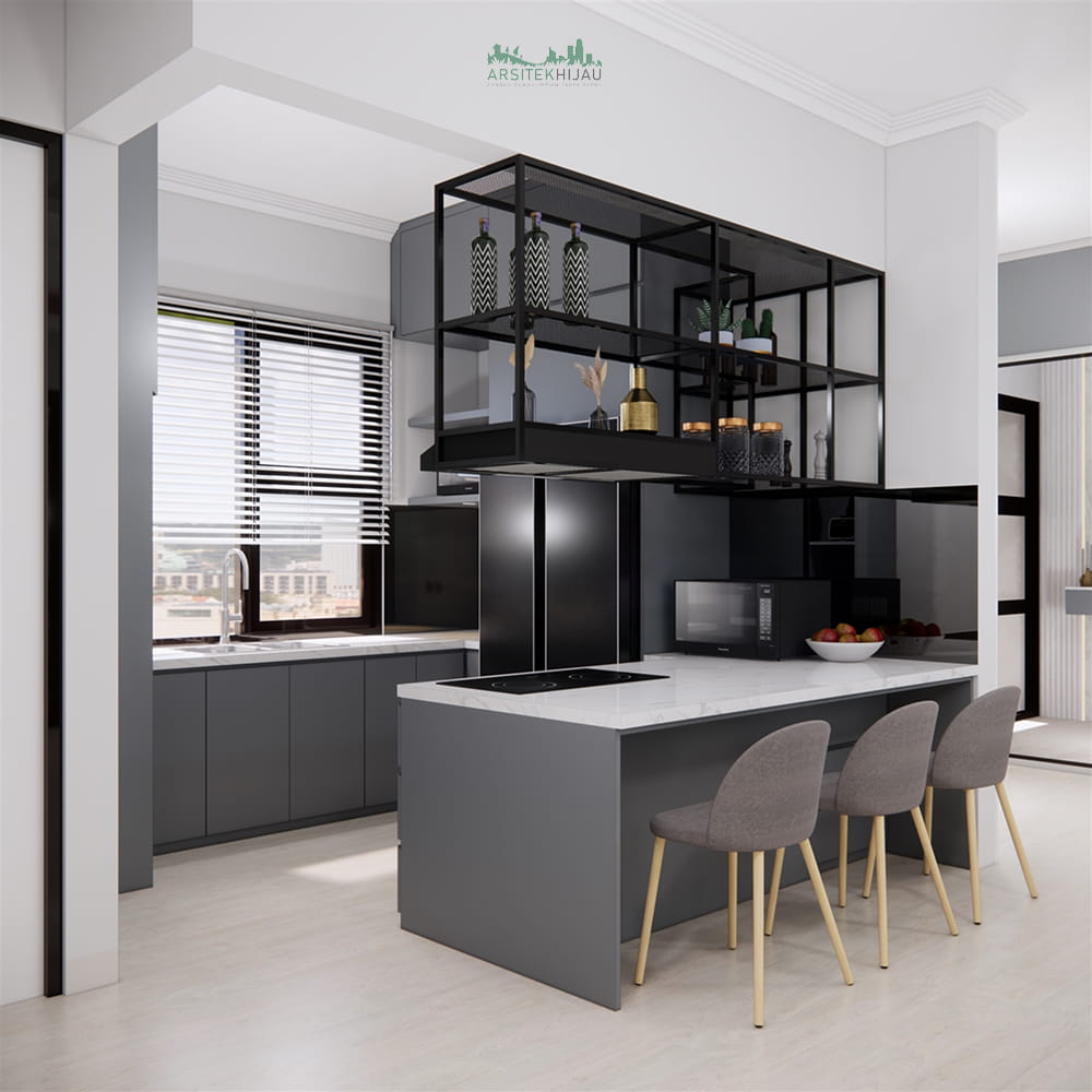 Area dapur dirancang dengan pendekatan industrial yang bersih dan modern, ditandai dengan penggunaan kabinet berwarna abu-abu gelap, top table yang terang, serta rangka besi hitam pada elemen rak gantung. Komposisi ini menciptakan tampilan dapur yang tegas dan tetap elegan. Cahaya alami dari jendela besar semakin memperkuat kesan lapang dan fungsional pada ruang dapur.