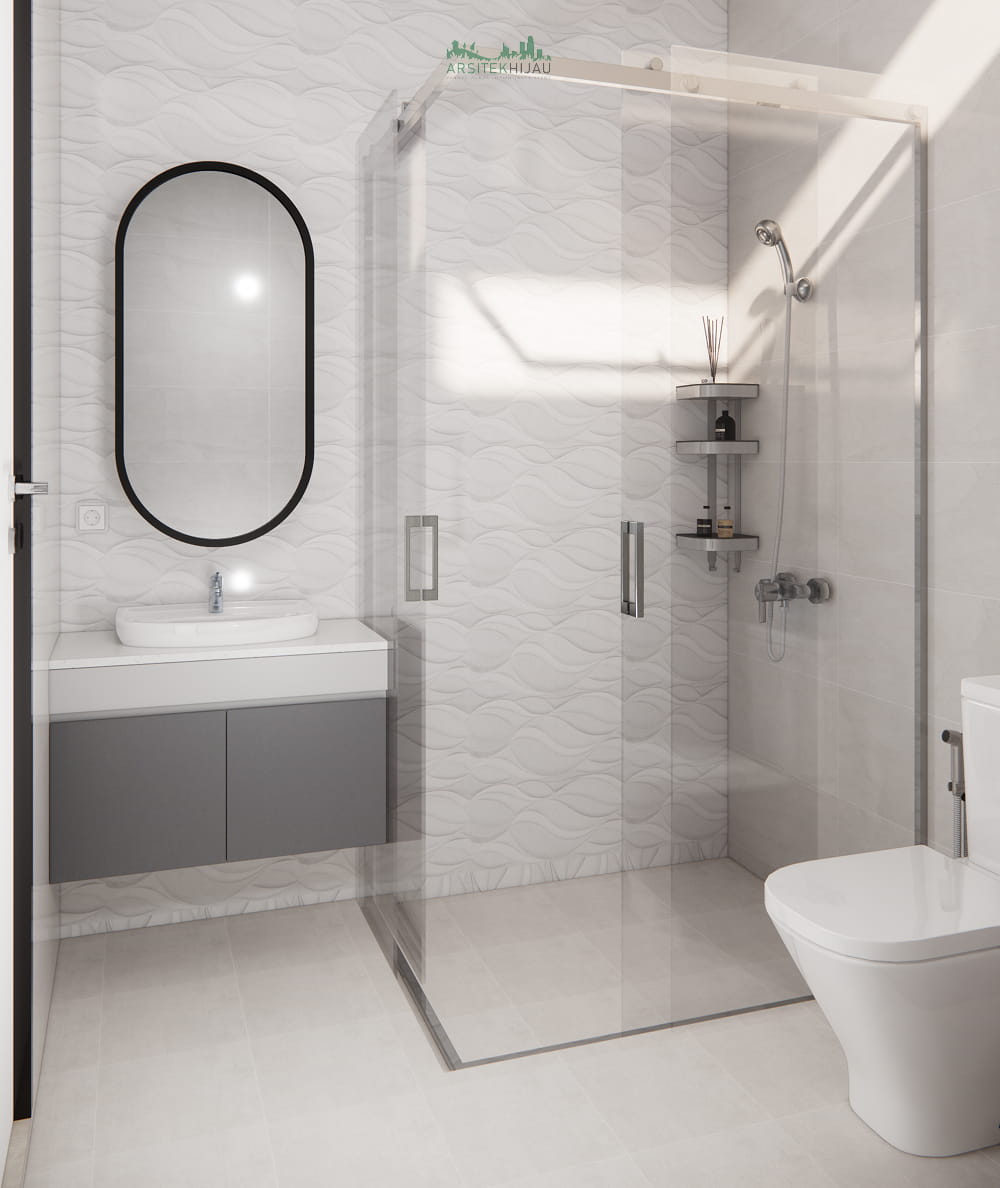 Kamar mandi lebih mendekati dan mengusung pendekatan minimalis yang bersih dan presisi. Permainan tekstur pada dinding, pemilihan sanitary berwarna lembut, serta pencahayaan yang tepat menciptakan kesan modern yang elegan. Tanpa dekorasi yang berlebihan, ruang ini justru terasa lebih eksklusif karena fokus pada fungsionalitas.
