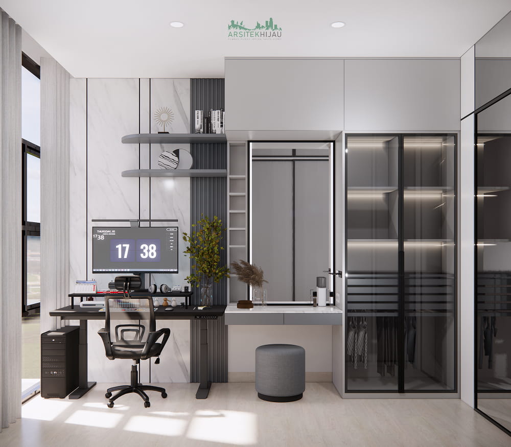 Meja kerja berada ditempat yang strategis dekat bukaan jendela agar mendapatkan pencahayaan alami yang maksimal dan mendukung kenyamanan visual saat bekerja. Lemari penyimpanan dengan pintu kaca transparan yang berbingkai hitam memberikan kesan rapi dan modern, sekaligus menjadi elemen visual yang memperkuat karakter ruang.