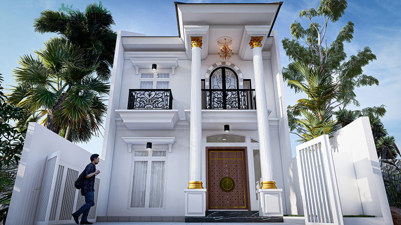 Pilar vertikal besar pada bagian fasad merupakan elemen struktural simbol visual utama dari arsitektur klasik. Dipadu dengan lis profil tebal di sekeliling jendela dan balkon, serta lampu gantung klasik di atas area pintu utama, keseluruhan komposisi menciptakan suasana megah dan timeless.