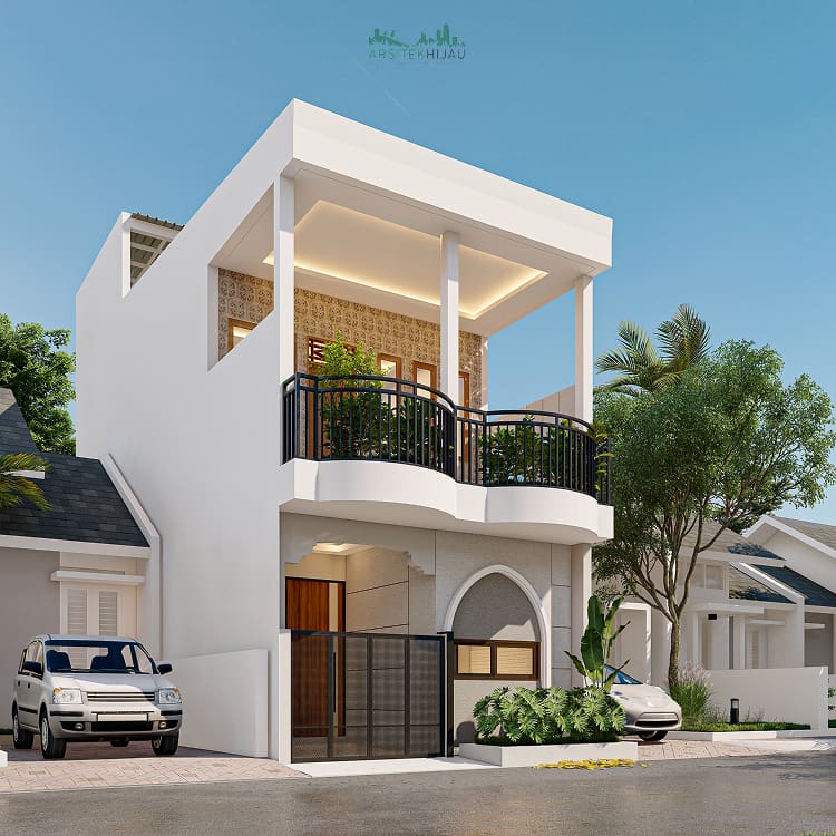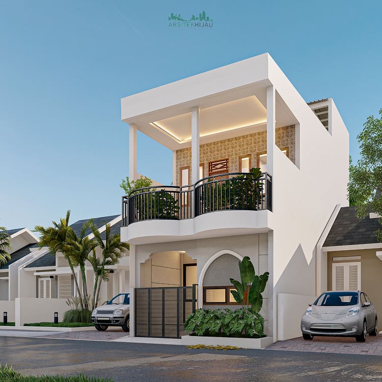 Tampilan fasad depan menjadi daya tarik utama pada rumah ini. Rumah yang dirancang dua lantai ini terlihat proporsional dan seimbang yang mencerminkan prinsip arsitektur klasik yang harmonis.