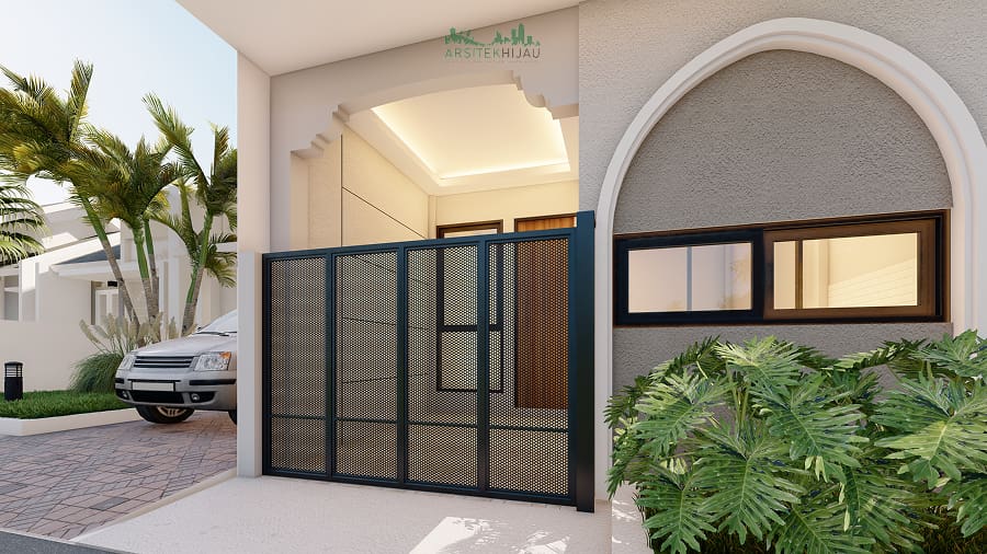 Pagar depan menggunakan material besi berlubang (perforated metal) dengan warna gelap yang kontras dengan fasad. Desain pagar ini dipilih untuk: