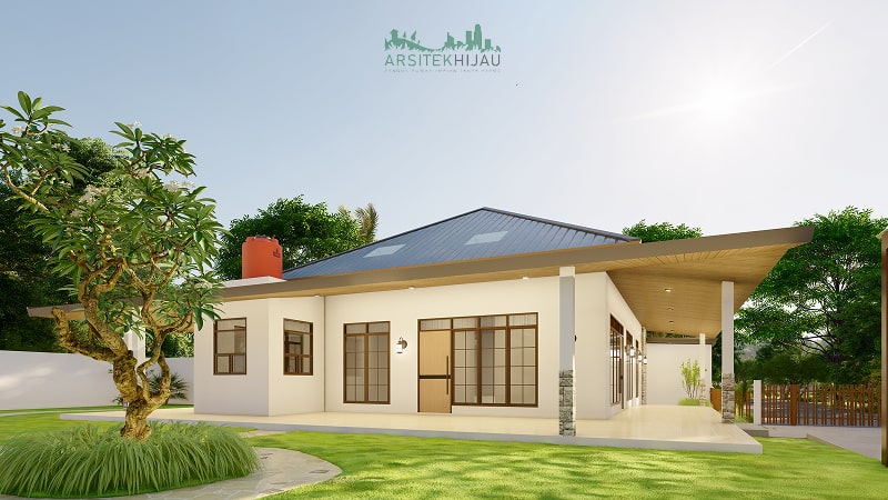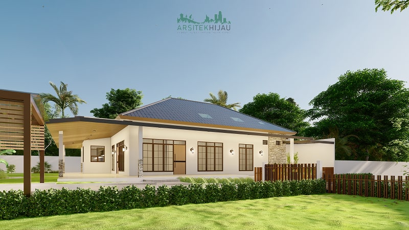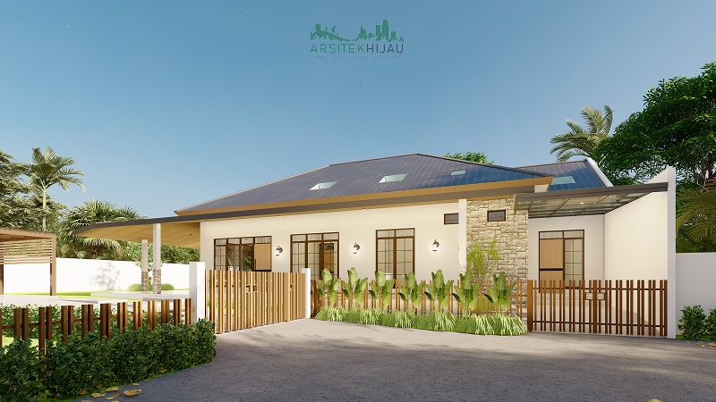 Bangunan utama memiliki bentuk atap pelana yang lebar dan tegas, dirancang agar air hujan mudah mengalir dan panas tidak terjebak di dalam ruang. Jendela-jendela besar di setiap sisi memastikan udara bergerak bebas, menciptakan ventilasi silang alami yang membuat rumah selalu terasa segar tanpa bergantung pada pendingin udara.