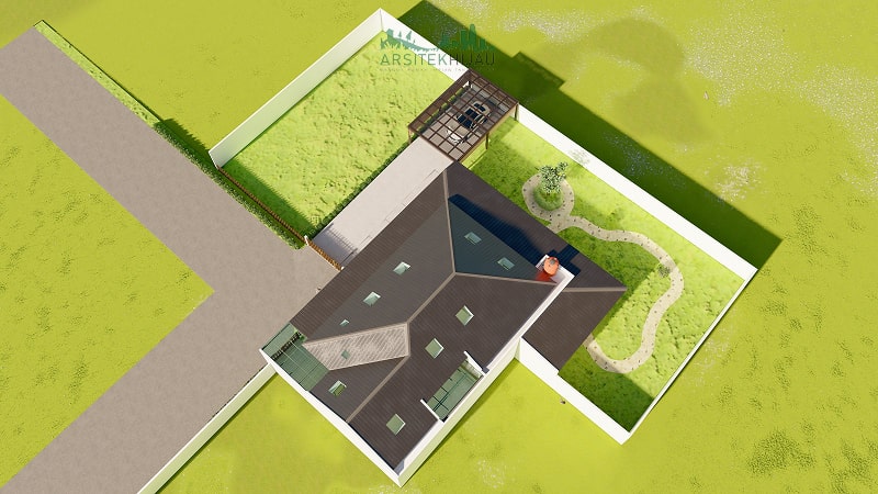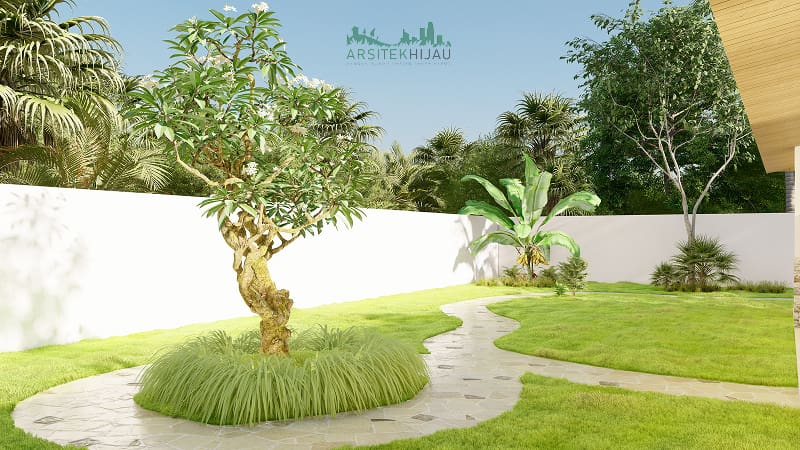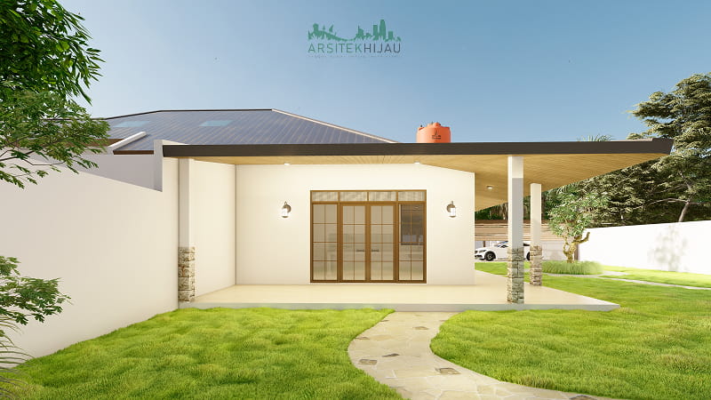 Bagian teras dan area taman menjadi elemen penting dalam desain ini. Arsitek Hijau merancang area dengan menambahkan jalur setapak melengkung yang menghubungkan ruang luar dan dalam secara halus, sehingga menciptakan pengalaman ruang yang menyenangkan. Dari ruang keluarga, penghuni bisa menikmati pemandangan taman yang menenangkan tanpa penghalang.