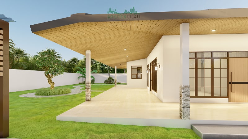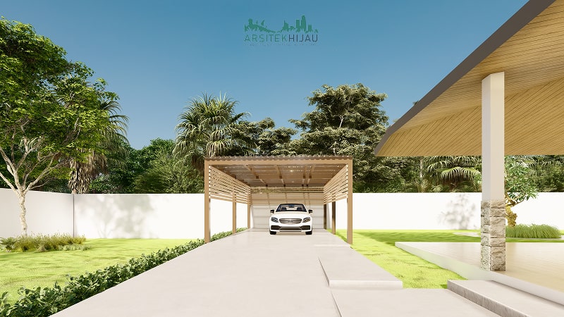 Salah satu elemen yang menonjol dari desain ini adalah area garasi dengan kanopi modern yang menggunakan struktur kayu dan rangka baja ringan yang menyatu dengan keseluruhan konsep bangunan.