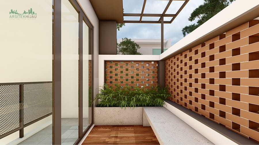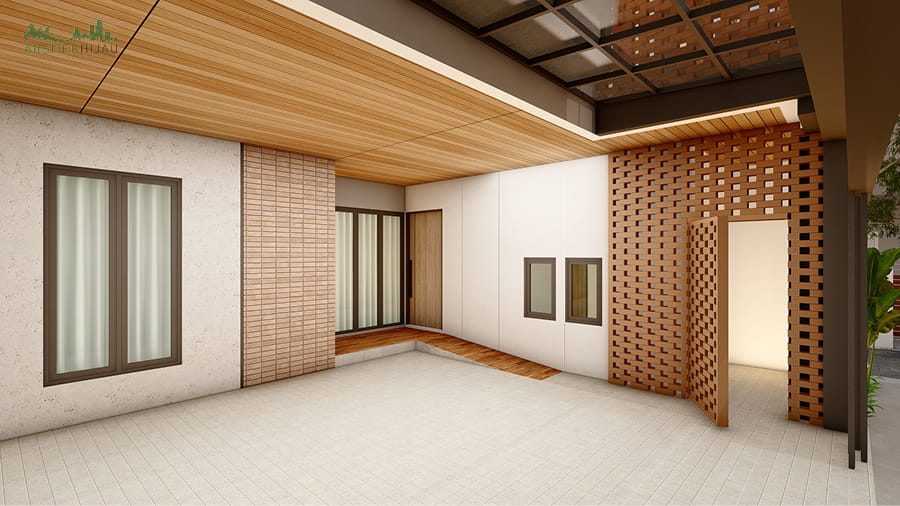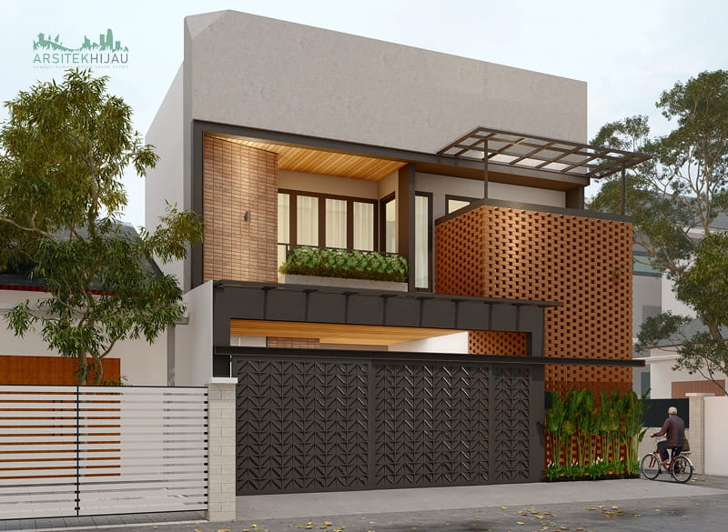 Bagian depan rumah menampilkan kombinasi material bata roster (bata berlubang) yang berfungsi sebagai elemen dekoratif sekaligus sebagai ventilasi udara. Dengan konsep seperti ini membuat rumah tetap sejuk meskipun berada di kawasan padat perkotaan.