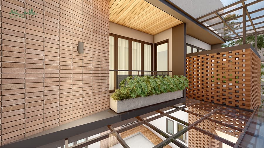 Area balkon lantai dua dilengkapi dengan railing sederhana serta taman mini yang menambah kesegaran secara visual. Konsep ini tidak hanya mempercantik rumah, tetapi juga menjadi area relaksasi bagi penghuni.