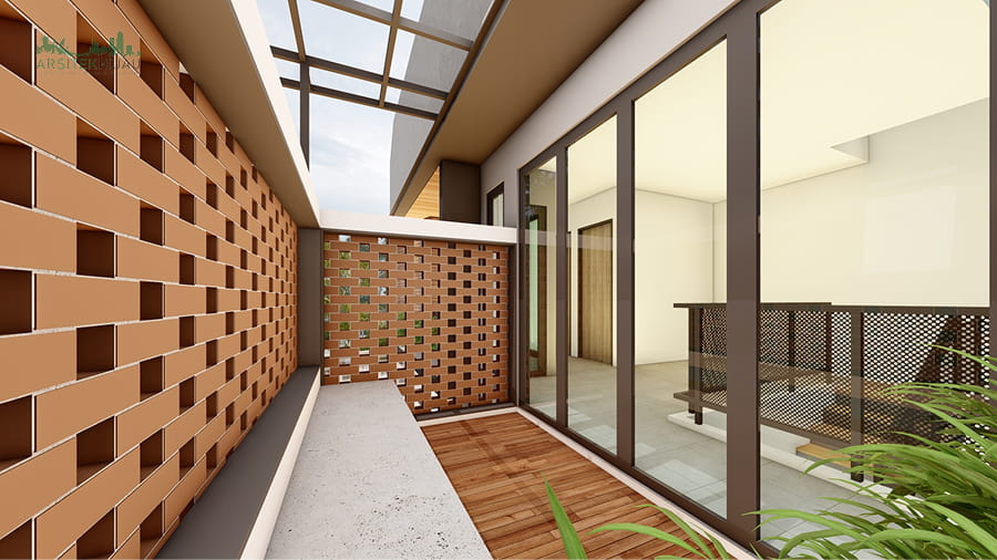 Bagian depan rumah menampilkan kombinasi material bata roster (bata berlubang) yang berfungsi sebagai elemen dekoratif sekaligus sebagai ventilasi udara. Dengan konsep seperti ini membuat rumah tetap sejuk meskipun berada di kawasan padat perkotaan.