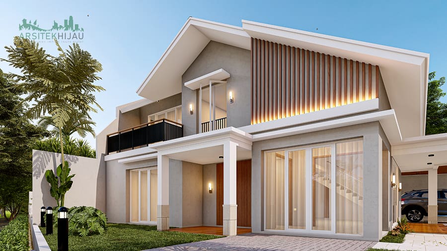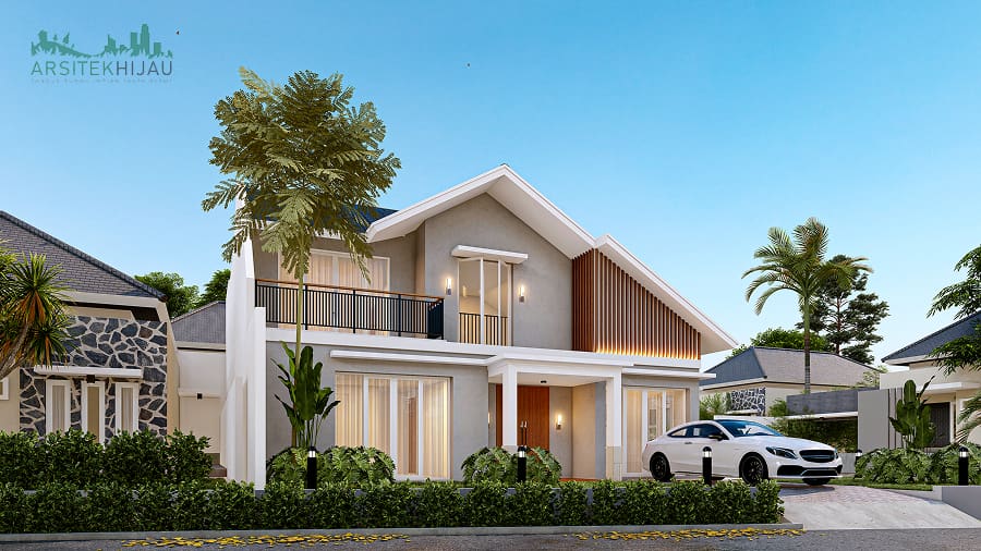 Bagian depan rumah menonjolkan dengan bentuk atap pelana yang khas rumah tropis. Elemen garis vertikal pada dinding kayu menambah kesan yang hangat dan natural, berpadukan dengan warna abu-abu netral sehingga menjadi tampak lebih modern. Kehadiran balkon pada lantai dua memberi nilai estetika sekaligus menambah fungsi tambahan sebagai ruang santai.