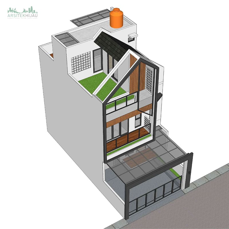 Sementara itu, lantai paling atas difungsikan sebagai area multi-guna, lengkap dengan rooftop garden. Ruang ini bisa digunakan sebagai tempat berolahraga ringan, ruang hobi, atau sekadar untuk bersantai di sore hari. Di paling atasnya lagi, ditambahkan ruang tempat tangki air, didesain menyatu dengan volume bangunan, sehingga tidak mengganggu estetika keseluruhan rumah.